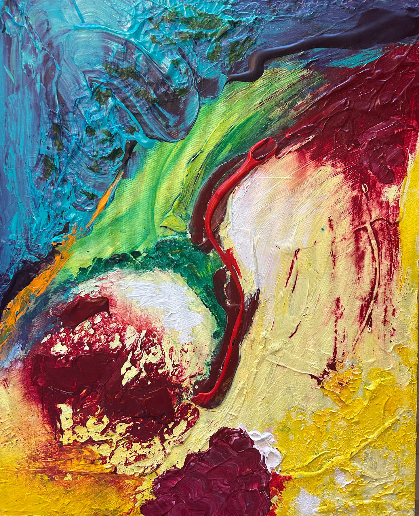 And so a few days ago I finally took out some paint. I reached for tubes intuitively, in other words, I picked colors that resonated: bright yellow and tomato red and almost neon orange. Oh, and white and turquoise. I took a large palette knife and scooped up the squiggles of paint and shimmied them onto the white canvas. And as so often happens when I start playing with paint, I felt a twinge of joy. It wasn’t like it hit me over the head or anything. It was more like it gave me a firm nudge in the ribs.